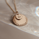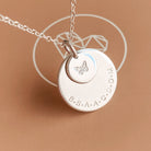 The big sister of our long-time favourite, Soren, the Saffron pendant combines the beauty of the stacked Soren with all the space of our beloved Charlotte. This leaves plenty of space for loved ones' names, birthdates or special text. Personalise with your text curved around the edge of the large pendant and an initial or symbol in the centre of the small pendant.